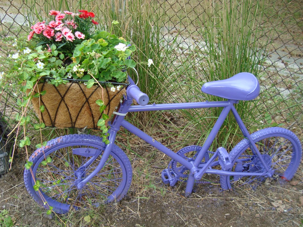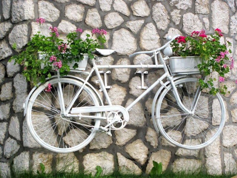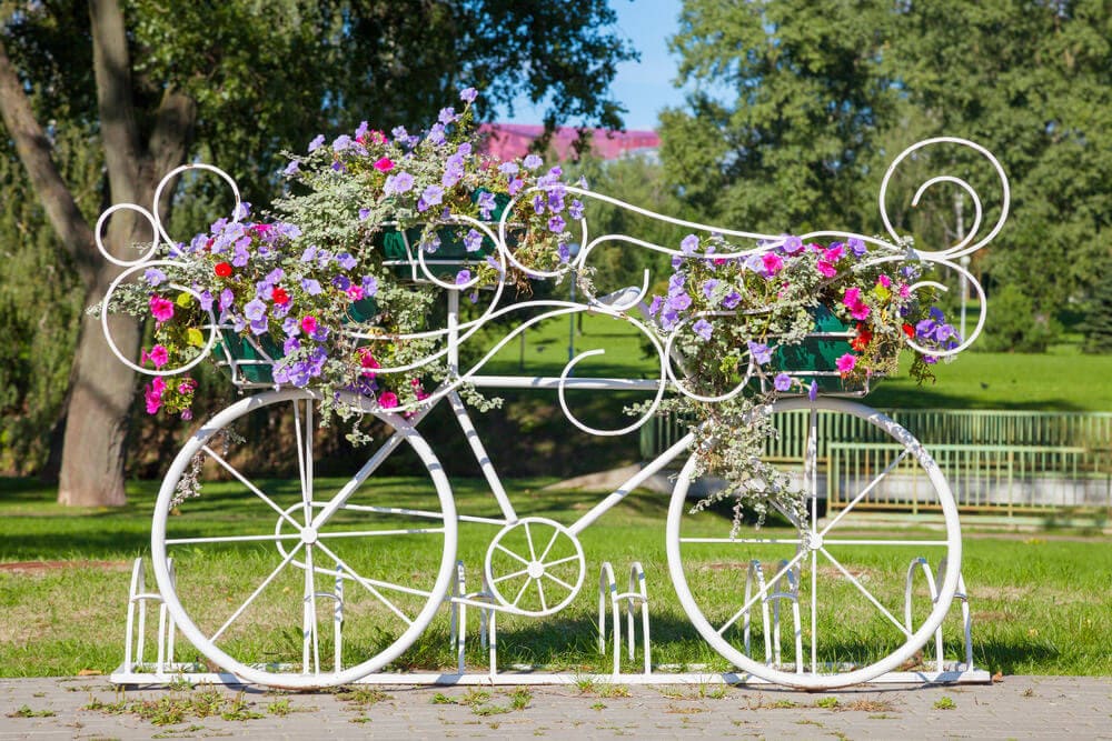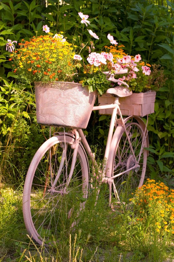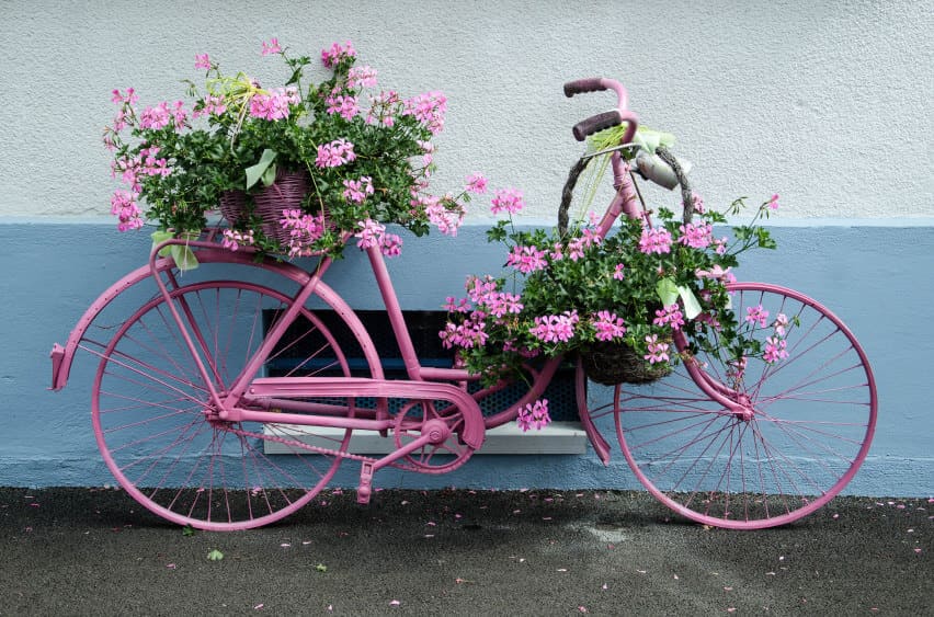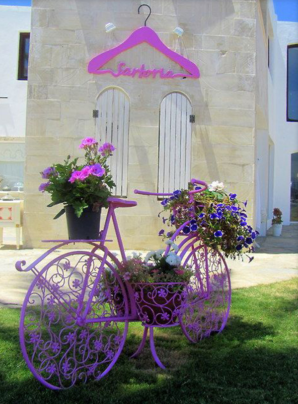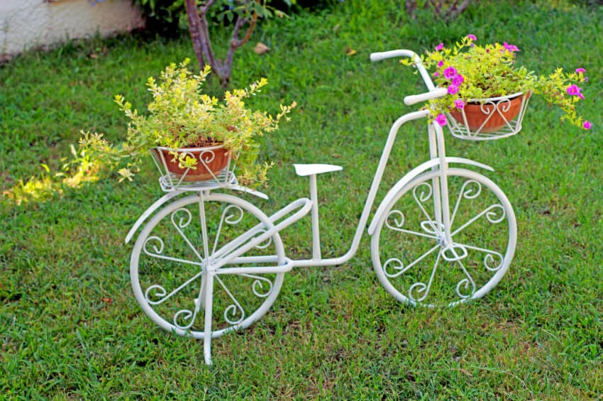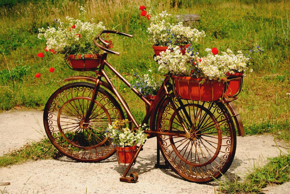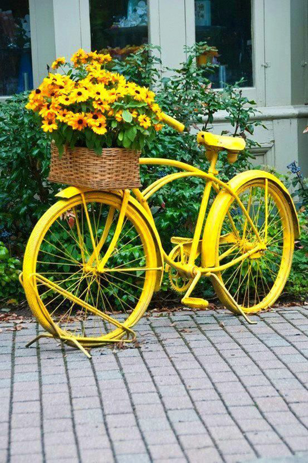 Starom biciklu možete dati novi sjaj i namenu jednostavnim čišćenjem i bojenjem. Bicikl ne mora da bude dobro očuvan, čak ne mora imati ni točkove. Osvežite ga, pričvrstite za zemlju u bašti i koristite ga kao vintage žardinjeru u koju ćete posaditi raznobojno mirisno cveće.